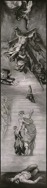 Dans la première pièce, juste en face de l’entrée, une œuvre d’Ernest Pignon-Ernest frappe par sa verticalité et par son dessin réalisé avec différentes nuances de gris. On est aussi immédiatement frappé par les personnages que l’on reconnait comme étant des citations du Tintoret. En bas du tableau, Marie est emmenée par sa mère Anne pour être présentée au temple. Mais ici l’escalier, courbe chez Le Tintoret, est droit et monte directement au ciel pour se perdre dans l’infini. Le grand prêtre a disparu, remplacé par un vide total. Sur la gauche, on remarque un personnage habillé comme nous le sommes aujourd’hui. Peut-être une allusion à son ami Régis Debray qui a écrit et commenté l’œuvre du Tintoret. En haut, Saint Marc plonge pour aller sauver un esclave comme dans le Miracle de Saint Marc conservé à la galerie de l’Académie à Venise. Au milieu de cette œuvre de presque deux mètres de haut, les personnages peints par Le Tintoret seront reconnus avec ou sans l’aide de Regis Debray dans « Le Tintoret Le sentiment panique de la vie ».