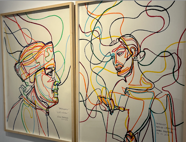 C’est le cas actuellement avec « Les rendez-vous des amis » qui regroupe Leonardo Cremoni, Gérard Fromanger, Roberto Matta et Ernest Pignon-Ernest, tous amis de Régis Debray. Dans cet espace de deux pièces où les tableaux sont exposés pour se confronter les uns avec les autres, il faut d’emblée se rendre à droite dans la pièce la plus éloignée de l’entrée pour voir deux portraits signés de G. Fromanger. Celui de Giotto di Bondone voisine avec celui d’Ambrogio Lorenzetti. Ces deux peintres de la renaissance italienne se regardent. Giotto, dont nous n’avons aucun portrait exécuté de son vivant, regarde Lorenzetti qui semble lui montrer une feuille qu’il tient dans ses mains. Les lignes courbes de toutes les couleurs s’entremêlent sur les deux toiles avec les traits noirs qui figurent le visage des deux peintres. Giotto coiffé de son bonnet et Lorenzetti tête nue sont vivants, ils vont parler, ils vont nous parler et sortir de cette atmosphère intemporelle dans laquelle ils baignent. Les couleurs de la chapelle Scrovegni à Padoue peinte par Giotto et l’allégorie de la fresque du bon gouvernement à Sienne peinte par Lorenzetti résonnent dans les yeux et les oreilles de celle ou de celui qui les regarde en silence.