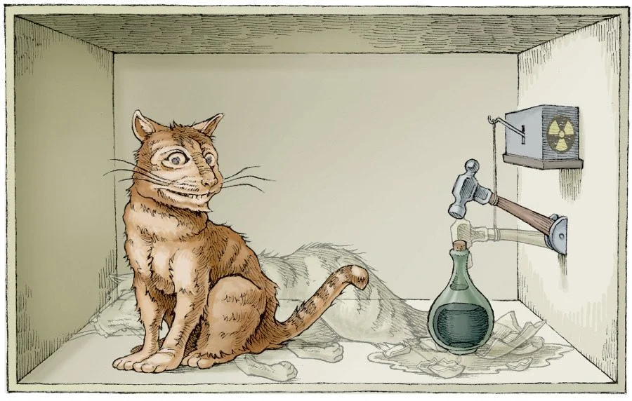 L’expérience imaginée par le physicien autrichien Erwin Schrödinger (1887 – 1961) illustre l’un des principes fondamentaux de la physique quantique. Pour en saisir l’idée centrale, il suffit d’imaginer un chat enfermé dans une boîte hermétique. À l’intérieur, un dispositif déclencheur, fonctionnant de manière strictement aléatoire, peut libérer un poison mortel ou ne rien faire du tout. Tant que la boîte reste fermée, l’état du chat est indéterminé : est-il vivant ou mort ? La physique quantique enseigne que toutes les possibilités coexistent simultanément, voire se superposent, jusqu’au moment où la boîte est ouverte et l’observation effectuée. Cette notion peut paraître absurde, voire choquante, car elle va à l’encontre du sens commun. Dans la vie quotidienne, un objet est soit dans un état, soit dans son contraire. Mais à l’échelle des particules subatomiques, comme les électrons, la réalité apparaît beaucoup plus floue. La mesure elle-même influence l’état observé : il est impossible de connaître simultanément la position et la vitesse d’un électron, car l’une perturbe l’autre. Il s’agit du principe d’incertitude d’Heisenberg (Cliquer).
