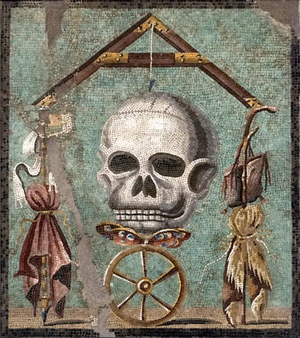 La mosaïque dont nous voulons traiter a été excavée en 1874 et mesure 47cm sur 41cm, elle est faite de centaines de toutes petite tesselles et la figure centrale représente ce que d’aucuns considèrent être le crâne d’un âne, Les archéologues du musée de Naples où cette mosaïque est conservée la décrivent ainsi : on y voit au zénith du crâne un niveau avec un fil métallique soutenant un fil à plomb suspendu, un outil que l’on utilise pour s’assurer que la construction est horizontale ou verticale. Un papillon coloré repose sous le crâne, peut-être une métaphore de l’âme. Sous eux, une roue symbolise probablement la fortune. Flanquant le crâne, attachés aux extrémités du niveau, se trouvent un sceptre et une cape violette à gauche, et un bâton de mendiant et une sacoche à droite. Cette juxtaposition suggère que le pouvoir et la richesse d’un côté sont en parfait équilibre avec la pauvreté de l’autre.