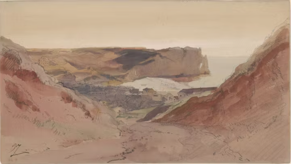 Vue d’Étretat, vers 1840-1845, pierre noire et aquarelle sur papier,